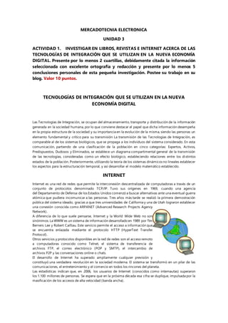 Este documento presenta información sobre diferentes tecnologías de integración utilizadas en la nueva economía digital como Internet, ERP, Call Center y Web Center. Explica brevemente el origen e historia de Internet y cómo ha evolucionado. Define qué es un ERP y para qué sirve en la gestión empresarial. También define qué es un Call Center y sus funciones principales de intermediación entre empresas y clientes. Por último, describe las características y beneficios de WebCenter Suite para crear aplicaciones y portales web.
