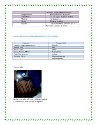 ACTIVIDAD 1Consigue un objeto que te llame la atención; por ejemplo, una cuchara, una lámpara, una mesa o solo un lápiz y completa el esquema. OBJETO<br /> Lápiz<br />Función que cumple Material al que esta hecho ventajas del material<br /> Sólida.<br /> Madera, Grafito <br /> <br />Un lápiz es un instrumento común de mano utilizado para escribir o dibujar.<br /> Cambios que, con el tiempo los materiales utilizados en su fabricación <br /> Antes: Utilizaban plumas de aves con tinta o piedras.Ahora: Se fabrican industrialmente mezclando polvo de grafito y arcilla molidos finamente, agregando agua, formando tiras largas como espagueti, y encendiéndolas en un horno.<br /> ACTIVIDAD 2 <br />. Entre los materiales mas comunes que se usan en las actividades tecnológicas tenemos los siguientes..Con tu cámara o celular busca un artefacto o utensilio que uses en tu casa, tómale una foto y edítala dando a conocer de que esta hecho y para que sirve cada una de sus parte<br /> Material Se Obtiene Papel De la pasta de madera Cartón A base de fibra virgen o de papel reciclado unidas mediante presión Conglomerado Prensando astilla de madera Contrachapa Se une capa o chapa de madera Madera Tronco de árbol Plástico Material sintético Hojalata Material metálico laminado que se forma con una capa de acero <br />Anota los insumos utilizados para obtener cada producto. <br /> Insumos Producto final Madera, clavos, pegamentos Muebles Harina, trigo Pan Hojas, Cartón Libros Vidrio, Plástico, Metal Automóviles Tela, Hilo, Botones Vestido Plástico, Vidrio Discos compactos Refrigeradores <br />Mueble: Silla <br />La silla es de color café, esta hecha por maderay para sentarse tiene un cojín de algodón. <br />