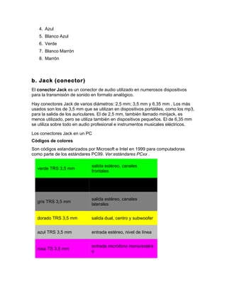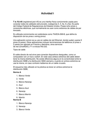 1. El documento describe diferentes tipos de conectores, cables y equipamiento de red comúnmente usados. Incluye detalles sobre conectores RJ-45, jack, racks y cables de categoría 5.