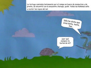 La historia trata sobre una tortuga y una serpiente charapa. La serpiente constantemente se burla de la tortuga llamándola lenta, tonta y fea. Más adelante, la serpiente queda atascada en las ramas y pide ayuda a la tortuga, pero ésta se niega. Al final, la tortuga salva a la serpiente comprendiendo que las palabras pueden herir, y desde entonces la serpiente aprende a no burlarse de los demás.