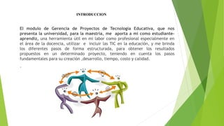 Este documento presenta un resumen de un curso de Gerencia de Proyectos de Tecnología Educativa. Incluye un mapa conceptual que explica el rol del profesional en el desarrollo de proyectos, los elementos necesarios para garantizar el ciclo de vida de un proyecto, y los principales responsables de establecer el ciclo de vida. También concluye que el curso enseña a crear proyectos que involucren las TIC para mejorar la calidad de la educación y lograr la innovación y transformación de las instituciones.