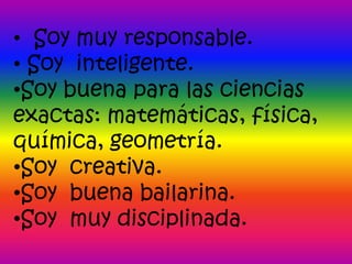 La persona describe sus talentos principales como ser responsable, inteligente y buena en las ciencias exactas. Considera que su mayor talento es la inteligencia. Aunque aún no ha definido su carrera, su objetivo es ser la mejor en lo que elija ya sea como médica o ingeniera y tener su propio negocio. Su proyecto de vida incluye ser la mejor en lo profesional, espiritual, social y familiar, viajar, casarse y tener hijos para ayudar a su país de Colombia y ser feliz.