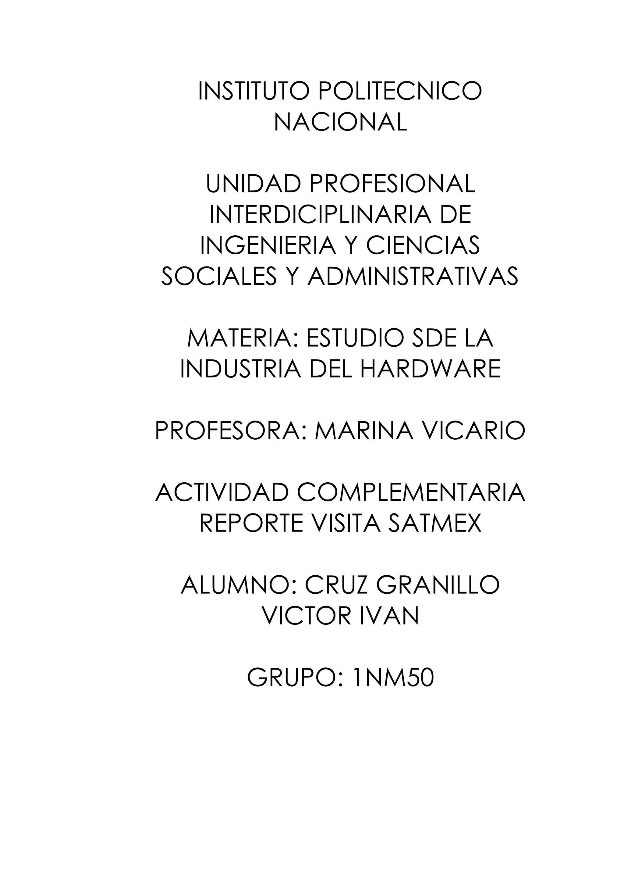 Este documento presenta un informe sobre una visita realizada al Centro de Operaciones Iztapalapa de Satmex. Se describe brevemente la historia y operaciones de Satmex, incluyendo los satélites que ha lanzado. La visita incluyó una explicación sobre los servicios y operaciones de Satmex, un tour por el área de monitoreo, y conversaciones sobre aspectos como la certificación de calidad y el perfil requerido para empleos en la compañía.