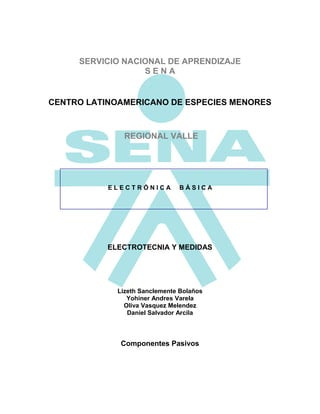 Este documento presenta una actividad sobre componentes pasivos como resistencias, condensadores e inductores. En la primera sección, se identifican los valores y tolerancias de varias resistencias. En la segunda sección, se determinan los colores asignados a diferentes resistencias según sus valores y tolerancias. En la tercera sección, se calcula el voltaje en un condensador después de dos segundos. Luego, se indican valores de condensadores según su código y se describen colores de bobinas inductivas. Finalmente, se halla la inductancia equivalente de tres bobinas