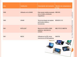 Este documento resume la historia de las computadoras en México desde 1958 hasta 2003, mencionando algunos de los modelos más importantes utilizados en instituciones como la UNAM, INEGI, Televisa e IBM. Describe brevemente las características y usos de computadoras como la IMB 650, BENDIX G15, IMB 7070, BullGomma-30, TRS-80 y la supercomputadora de INTEL de 2003.