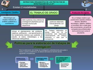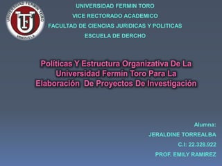 El documento detalla la estructura organizativa de los proyectos de investigación en la Universidad Fermín Toro, destacando dos modalidades para el trabajo de grado: individual y en pareja. Se enfatiza la importancia de seguir criterios específicos de investigación, así como la necesidad de que los trabajos muestren claridad, coherencia y dominio de los métodos. Además, se menciona que para optar a títulos académicos, los trabajos deben ser de autoría individual y reflejar principios de honestidad y ética.