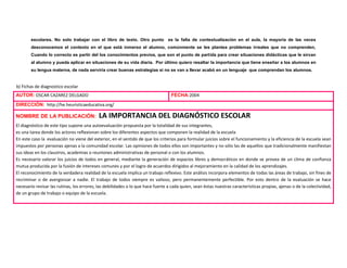 El documento discute la importancia de realizar diagnósticos escolares. Señala que los diagnósticos deben incluir la reflexión de todos los miembros de la comunidad escolar, incluyendo profesores, alumnos, personal y familias. El propósito es describir la situación actual de la escuela para identificar áreas de mejora. Un diagnóstico efectivo requiere la revisión de rutinas, debilidades, fortalezas individuales y colectivas para establecer redes de colaboración que mejoren la calidad educativa.