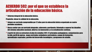 El Acuerdo 20/11/19 modifica el Acuerdo 12/10/17 sobre el plan y programas de estudio para la educación básica en México. Integra la educación básica en 12 años divididos en educación inicial, primaria y secundaria. Establece tres componentes curriculares para ampliar la formación académica, potenciar el desarrollo personal y social, e incluir nuevos contenidos relevantes. Mantendrá los planes de estudio ya establecidos para ciertos grados a fin de garantizar una transición armónica entre los diferentes