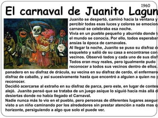 Este documento narra la historia de Juanito Lagun, un niño que vivía en un pueblo aburrido donde todos se conocían. Una noche de carnaval, Juanito salió disfrazado de esqueleto y observó a todos sus vecinos disfrazados, aunque podía reconocerlos. Sin embargo, encontró a alguien a quien no pudo reconocer disfrazado de parca, y decidió seguirlo más allá de las calles donde no había llegado el carnaval, perdiéndose y nunca más volviendo al pueblo.