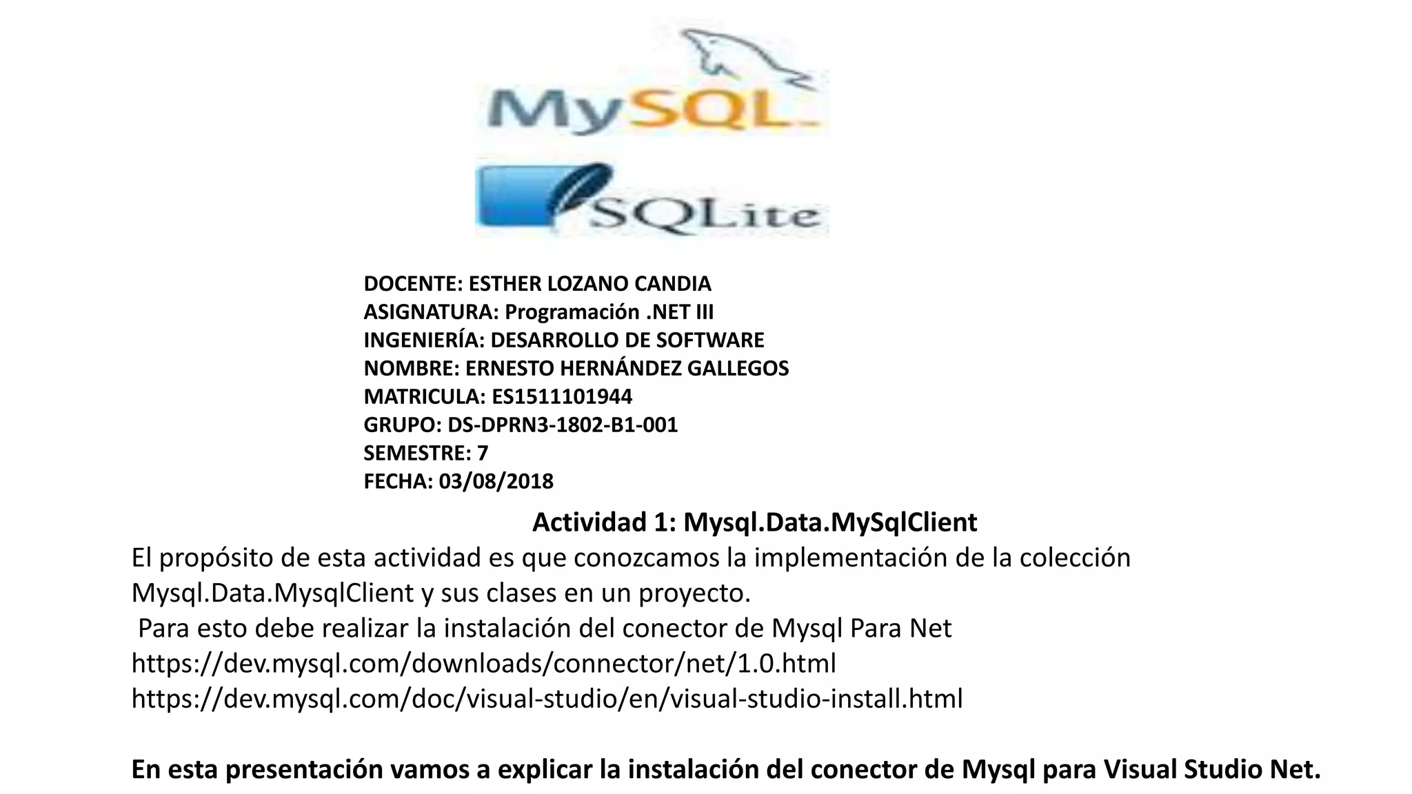 La actividad 1 se centra en la implementación de la colección mysql.data.mysqlclient en un proyecto .NET, detallando la instalación del conector de MySQL para Visual Studio. Se explican las clases principales de mysqlclient, incluyendo mysqlconnection, mysqldataadapter, y mysqlcommand, junto con sus funciones específicas. Además, se incluyen enlaces bibliográficos para mayor referencia sobre el conector y sus componentes.