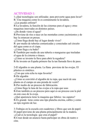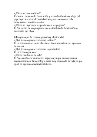 El documento describe las tecnologías relacionadas con el suministro de agua, la fabricación de ropa y libros, y cómo la vida cambiaría sin electricidad. Explica que el agua llega a las casas a través de tuberías desde ríos y presas, y que la ropa de algodón y lana se produce mediante procesos de fabricación. Los libros se hacen a partir del papel producido de árboles y se imprimen las palabras. Sin electricidad, aparatos como la televisión y celulares serían inútiles, mientras que
