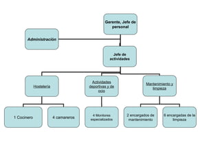 El documento presenta la estructura organizativa de un complejo turístico con diferentes departamentos y puestos de trabajo. El gerente y el jefe de personal supervisan a los jefes de las áreas de hostelería, actividades deportivas y de ocio, y mantenimiento y limpieza.