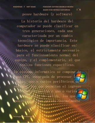 El documento describe el hardware de las computadoras. Explica que el hardware incluye todas las partes físicas como componentes electrónicos, cables, gabinetes, periféricos, etc. Además, clasifica el hardware en básico, necesario para el funcionamiento de la computadora, y complementario, para funciones específicas. Por último, señala que todo sistema informático necesita hardware dedicado a procesamiento, almacenamiento, entrada y salida de datos.