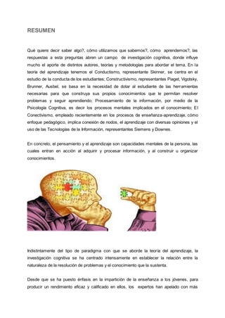 El documento discute varias teorías del aprendizaje como el conductismo, constructivismo, procesamiento de información y conectivismo. Explica que el aprendizaje implica procesar información y construir conocimiento. También analiza cómo la investigación cognitiva ha mejorado la comprensión del aprendizaje y cómo se puede aplicar esta comprensión en entornos educativos.
