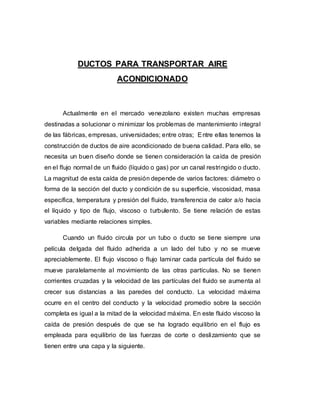 Este documento describe los diferentes tipos de ductos y materiales utilizados para el transporte de aire acondicionado. Incluye ductos fabricados con fibra de vidrio o lámina metálica, así como materiales de aislamiento térmico y acústico. También explica los métodos de cálculo de costos como determinar los CFM requeridos, calcular pérdidas en ductos rectos y curvos, y seleccionar tamaños y geometrías apropiadas.
