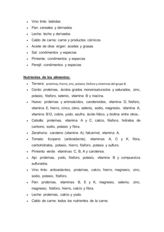 La receta describe cómo hacer albóndigas en salsa. Incluye ingredientes como carne de ternera, cerdo, huevo, verduras y especias. Explica que los principales nutrientes de estos ingredientes son proteínas, vitaminas y minerales. La receta proporciona un plato equilibrado y saludable.