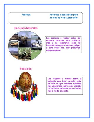 Este documento presenta las acciones que se pueden tomar en cuatro ámbitos (recursos naturales, población, industria y gobierno) para lograr estilos de vida más sustentables. Propone acciones como cuidar y no explotar los recursos naturales, crear conciencia sobre el manejo sustentable de los recursos entre la población, reducir la contaminación de la industria y obtener apoyo gubernamental para nuevas iniciativas ambientales.