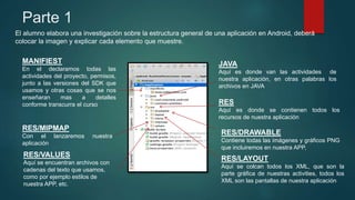 El documento explica la estructura general de una aplicación en Android. Se divide en tres partes principales: el manifiesto, donde se declaran las actividades y permisos; el código Java, donde van las actividades; y los recursos como imágenes, layouts y valores. También analiza línea por línea el código de un archivo de manifiesto para explicar el propósito de cada elemento.