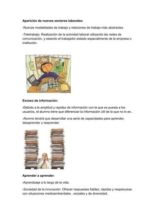 La sociedad de la información se caracteriza por ser globalizada y girar en torno a las tecnologías de la información y la comunicación (TIC). Esto ha dado lugar a nuevos sectores laborales como el teletrabajo, pero también a un exceso de información que requiere que las personas aprendan a aprender de forma continua. La sociedad de la información alcanza todos los sectores e incluye tanto oportunidades como desafíos como la brecha digital y la necesidad de una reflexión crítica sobre el rápido cambio tecnológico.