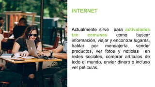 El documento describe la evolución y usos del internet, incluyendo su uso científico y académico en las décadas de 1950 y 1970, su uso actual para actividades como buscar información y comunicarse, y su uso como medio de entretenimiento a través de redes sociales como Facebook e Instagram. También describe conceptos como páginas web, buscadores como Google que indexan páginas web, y aplicaciones y servicios en la nube.