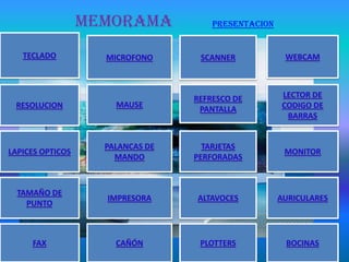 Este documento lista y describe brevemente varios dispositivos de entrada y salida comunes para computadoras, incluyendo teclados, micrófonos, escáneres, cámaras web, monitores, impresoras, altavoces y más. Proporciona detalles sobre la función de cada dispositivo y cómo interactúan con el computador.