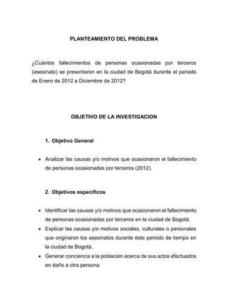 Este documento describe un estudio estadístico sobre los asesinatos en Bogotá, Colombia en 2012. El estudio busca determinar la cantidad de muertes causadas por terceros y analizar las causas y motivos subyacentes, ya sean sociales, culturales, personales o psicológicos. El estudio justifica su importancia debido a que la tasa de mortalidad por asesinatos disminuyó significativamente en 2012, por lo que es necesario comprender mejor las causas para abordar este problema y generar conciencia pública.