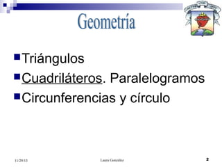 El documento aborda conceptos básicos de geometría, como triángulos, cuadriláteros, paralelogramos, circunferencias y círculos. Los estudiantes aprenderán a clasificar y operar con diferentes figuras geométricas, así como calcular sus áreas y perímetros. También se enfoca en reconocer elementos notables y propiedades de estas figuras en situaciones reales.