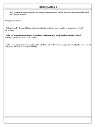 El documento habla sobre la educación en línea. Define la educación en línea como una modalidad de educación a distancia que habilita un entorno de comunicación para los procesos de enseñanza y aprendizaje a través de las tecnologías de la información y la comunicación. Luego describe algunas características, ventajas y desventajas de la educación en línea. Finalmente, hace preguntas sobre aplicaciones principales de la educación en línea.