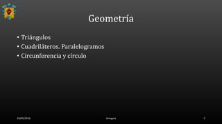 Este documento presenta las notas de una clase de geometría sobre triángulos, cuadriláteros, paralelogramos, círculos y circunferencias. Explica los elementos básicos de estos objetos geométricos, cómo clasificarlos y calcular sus áreas y perímetros. También cubre cómo reconocer y distinguir entre triángulos, cuadriláteros y paralelogramos comunes.