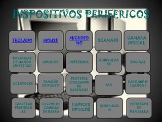 Este documento describe varios dispositivos periféricos comunes utilizados con computadoras, incluyendo teclados, mouse, micrófonos, escáneres, cámaras digitales, monitores, impresoras, audífonos y altavoces. Explica brevemente las funciones y usos de cada dispositivo.