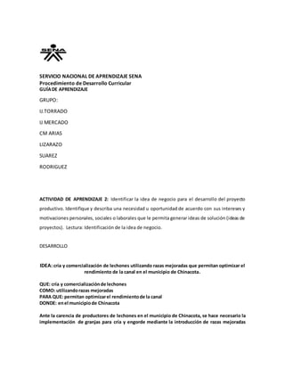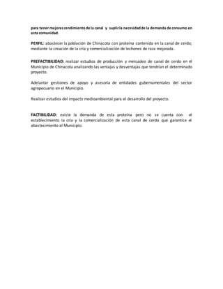 El documento presenta una idea de negocio para la cría y comercialización de lechones en el municipio de Chinacota utilizando razas mejoradas. La idea es satisfacer la demanda de carne de cerdo en la región ante la carencia de productores locales mediante la optimización del rendimiento de la canal. El perfil del proyecto es abastecer a la población con proteína de cerdo. La prefactibilidad incluye estudios de mercado y producción, así como gestiones de apoyo gubernamental considerando aspectos ambientales.