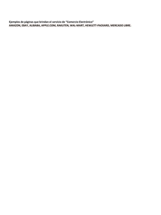 El documento habla sobre el comercio electrónico. Define el comercio electrónico como la compra y venta de productos o servicios a través de medios electrónicos como Internet. Menciona algunas ventajas como encontrar productos a menor costo y realizar mejor negociación con el vendedor. También menciona desventajas como la falta de cercanía entre vendedor y comprador. Finalmente, da ejemplos de páginas populares que ofrecen servicios de comercio electrónico como Amazon, eBay, Alibaba y Apple.