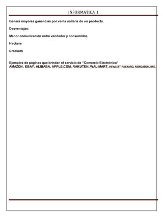 El documento habla sobre el comercio electrónico. Define el comercio electrónico como la compra y venta de productos o servicios a través de medios electrónicos como Internet. Explica que ofrece ventajas como encontrar productos a menor costo y realizar compras con comodidad, pero también tiene desventajas como una menor comunicación entre vendedores y compradores. Da ejemplos de páginas populares que ofrecen servicios de comercio electrónico como Amazon, eBay, Alibaba y Mercado Libre.
