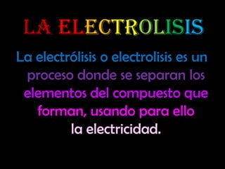 La electrólisis es un proceso donde se separan los elementos de un compuesto usando electricidad. El documento describe un experimento de electrólisis usando yoduro de potasio, una pila, agua y electrodos para separar el yodo del potasio a través de la aplicación de una corriente eléctrica.