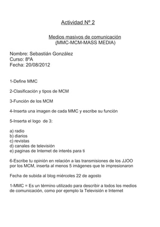 Este documento resume las actividades de un estudiante sobre los medios masivos de comunicación. Define MMC e incluye la clasificación y tipos de medios como revistas, prensa, radio, vía pública, internet y televisión. Explica la función de los medios de dar información y presenta imágenes con la función de cada medio como diarios, radio, televisión, internet y vía pública. Muestra logos de medios y la opinión del autor es que las transmisiones de los Juegos Olímpicos tuvieron gran cobertura en televis