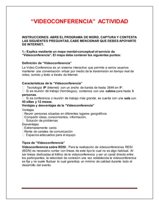 El documento explica la videoconferencia, incluyendo su definición como un sistema interactivo que permite conversaciones virtuales a través de video, audio y texto en tiempo real por Internet, así como sus características, ventajas y desventajas, y tipos. También describe los recursos necesarios para establecer una videoconferencia como un conjunto de tecnologías de telecomunicación que permiten interacción entre personas en diferentes ubicaciones a través de transmisiones de audio y video bidireccionales.