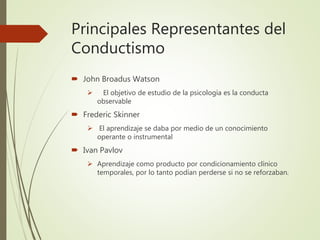 Los principales representantes del conductismo fueron John Watson, Frederic Skinner e Ivan Pavlov. Watson estableció los principios del conductismo al rechazar la introspección y explicar la conducta solo en términos de estímulos y respuestas. Skinner estudió el aprendizaje operante mediante refuerzos. Pavlov descubrió el condicionamiento clínico al estudiar la salivación canina. Los principales representantes del constructivismo fueron Lev Vigotsky, Jean Piaget y David Ausubel. Vigotsky enfatizó el papel de la cultura