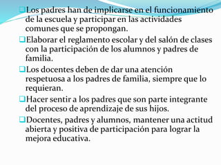 El documento propone estrategias para renovar el pacto entre estudiantes, docentes, familias y escuelas. Estas estrategias incluyen la participación de los padres en la escuela y en la elaboración del reglamento, dar atención respetuosa a los padres y hacerlos sentir parte del proceso de aprendizaje, y mantener una actitud abierta y positiva entre padres, docentes y alumnos.