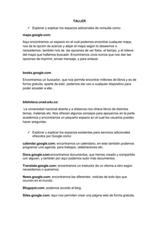 Este documento resume varias herramientas telemáticas como Google Maps, Google Books y la biblioteca virtual de la UNAD. También explora servicios adicionales de Google como Calendar, Docs y Translate. Define términos como Web 2.0, redes sociales, dirección IP, DNS y otros relacionados con internet. Finalmente, compara tres motores de búsqueda y resume sus características comunes como resultados en la web, imágenes y videos, así como opciones de traducción.