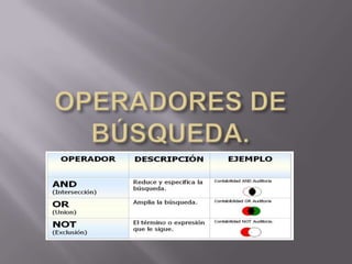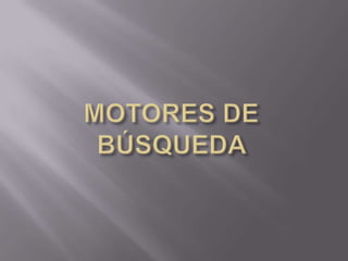 Este documento define los motores de búsqueda como herramientas que permiten a los usuarios buscar información en bases de datos en línea. También describe los metabuscadores, que buscan información en varios motores de búsqueda a la vez, RSS que distribuyen actualizaciones de sitios web de forma automática, y los conectores y operadores lógicos que se usan para realizar búsquedas avanzadas.