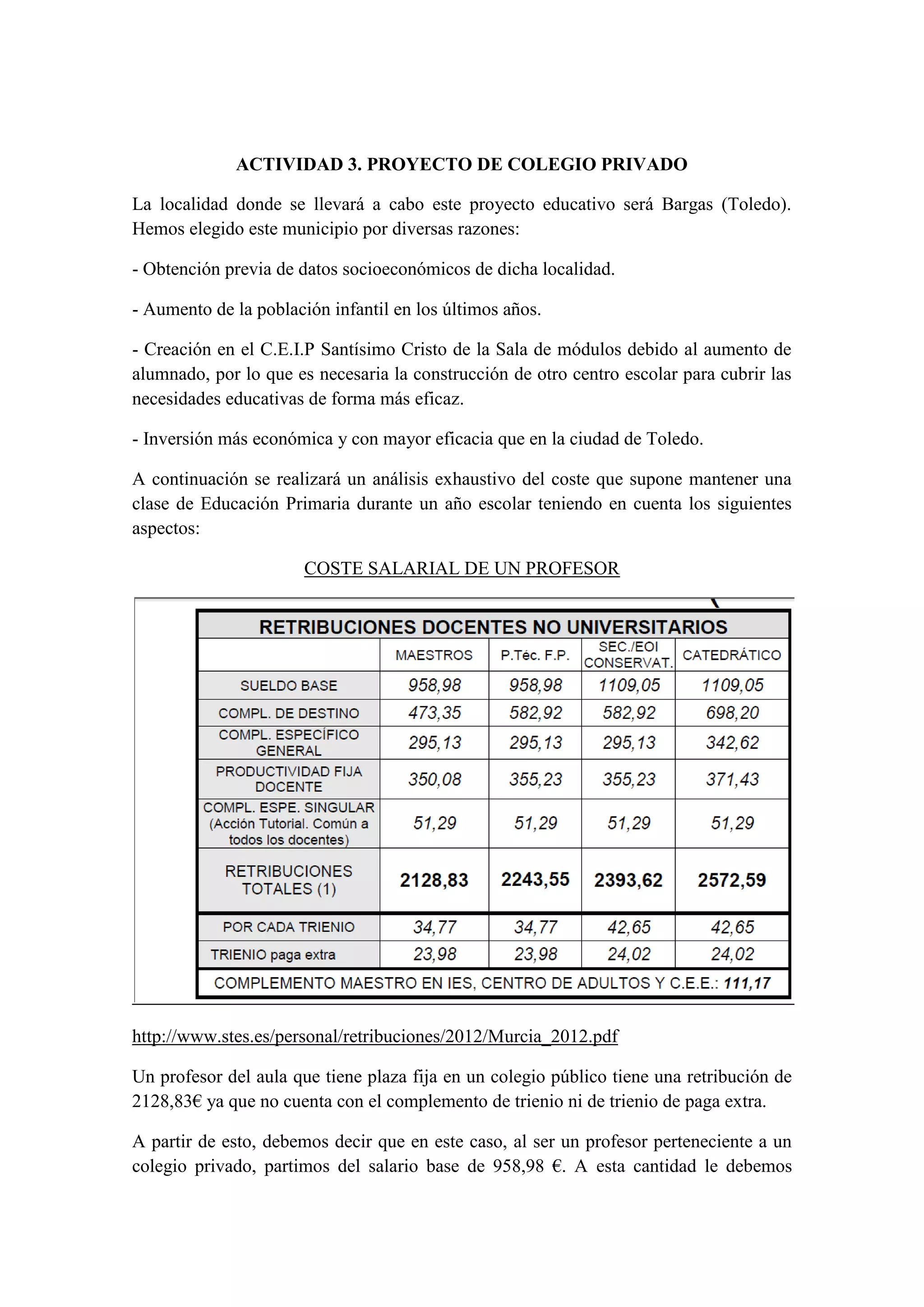 Este documento describe un proyecto para abrir un colegio privado en Bargas, Toledo. Se analizan los costes de mantener una clase, incluyendo el salario de un profesor (18,745.72€ al año) y los gastos de materiales e instalaciones (12,099.07€ al año). El coste total para cada alumno sería de 114.23€ al mes. El colegio ofrecería clases de 9 a 14 horas y actividades extracurriculares por las tardes de lunes a viernes para reforzar los aprendiz