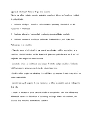 Este documento trata sobre la estadística, que es la ciencia que utiliza conjuntos de datos numéricos para obtener inferencias basadas en probabilidades. Explica que la estadística se divide en descriptiva, inferencial y matemática, y da ejemplos de aplicaciones como la educación, contaduría, administración y economía. También define conceptos clave como población, muestra, frecuencias y diagramas usados en estadística.