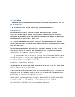 Este documento discute las competencias y su concepción constructivista. Define las competencias como conjuntos integrados de conocimientos, habilidades y actitudes vinculadas a una profesión que conducen a un desempeño adecuado. Las competencias implican que los estudiantes aprenderán no solo información sino cómo aplicarla. La concepción constructivista ve a las competencias como conocimiento en acción que requiere la integración de varios recursos en contextos prácticos.