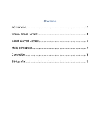 El documento aborda las formas de control social en la administración, diferenciando entre el control formal, impuesto por autoridades mediante leyes y regulaciones, y el control informal, que se ejerce a través de normas y costumbres sociales. Se discuten las características, efectividad y contextos de aplicación de ambos tipos de control, señalando que el formal es más efectivo en sociedades grandes. Finalmente, se destaca la importancia del control social para mantener el orden en la sociedad y su relación con diversas disciplinas.