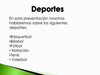 Este documento presenta resúmenes breves de seis deportes populares: baloncesto, béisbol, fútbol, natación, tenis y voleibol. Describe los fundamentos básicos de cada deporte, incluyendo el número de jugadores, el equipo, el campo de juego y el objetivo principal.