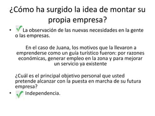 Este documento discute los motivos para iniciar un negocio propio, como la observación de nuevas necesidades y oportunidades en el mercado. Un ejemplo dado es de Juana, quien inició un negocio de guía turístico por razones económicas, para generar empleos y mejorar un servicio existente. El objetivo personal principal de iniciar un negocio es la independencia y el dinero. La persona no se siente suficientemente preparada actualmente pero planea asistir a charlas y eventos para adquirir más conocimientos y mejorar su