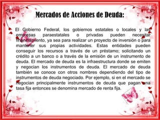 El documento describe el mercado de deuda en México. Explica que el gobierno, empresas estatales y privadas pueden necesitar financiamiento y emitir instrumentos de deuda como bonos y certificados negociados en el mercado de deuda. Este mercado incluye un mercado primario donde se emiten nuevos instrumentos y un mercado secundario donde estos se negocian entre inversionistas. Finalmente, detalla los diferentes tipos de instrumentos de deuda emitidos por el gobierno, bancos y empresas en México.