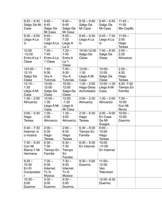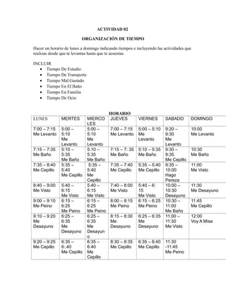 El documento presenta el horario semanal de una persona, dividiendo cada día de la semana en intervalos de tiempo e indicando las actividades realizadas en cada uno, como levantarse, bañarse, desayunar, asistir a clases, hacer tareas, pasar tiempo en familia y ocio. El horario muestra una rutina similar cada día, aunque con algunas variaciones en las horas y actividades entre semana y fin de semana.