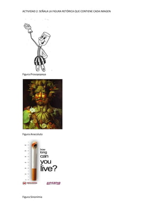 El documento presenta una actividad en la que se piden identificar la figura retórica contenida en diferentes imágenes. Se enumeran doce figuras retóricas diferentes como prosopopeya, anacoluto, sinonimia, hipérbole, ironía, alegoría, oposición, metonimia, zeugma, acumulación, epanadiplosis y reduplicación.