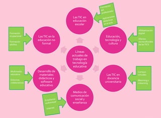 El documento describe varias líneas de trabajo en tecnología educativa, incluyendo el uso de TIC en educación escolar y universitaria, el desarrollo de materiales didácticos y software educativo, el uso de TIC en educación no formal como la formación ocupacional y de adultos, el uso de multimedia educativa, entornos colaborativos y campus virtuales, y el aprendizaje móvil y a distancia, así como la alfabetización digital y los efectos socioculturales de las TIC.